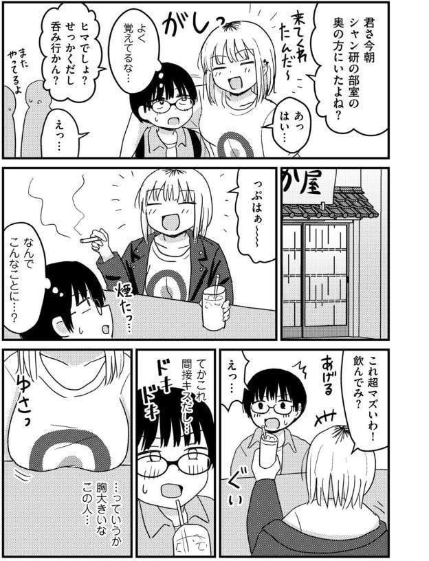 僕は田中智樹。大学に入学したものの 特にやりたいことが見つからず、 男しかいないサークルで ただただゲームをする日々を過ごしている。 ある日、サークルの部室へ 金髪にピアス、そして革ジャンを羽織った 見知らぬ女性がやってきた。 聞くと、その人は大嶋莉子さんといい、 文化サークルに顔の広い、 年齢不詳のよく分からない人らしい。 その大嶋さんと、ひょんなことから サシ飲みすることになった。 距離感が近…